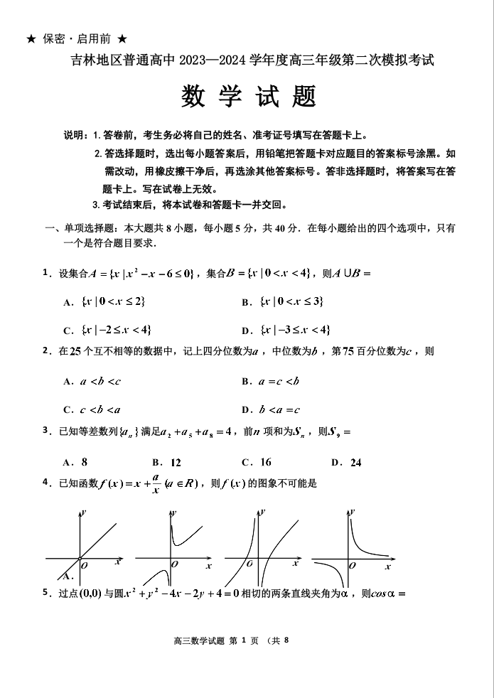 吉林省吉林市2024届高三上学期第二次模拟考试数学