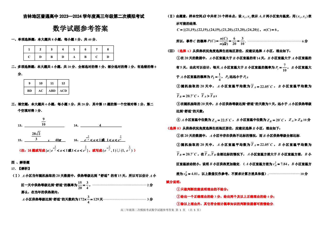 吉林省吉林市2024届高三上学期第二次模拟考试数学答案