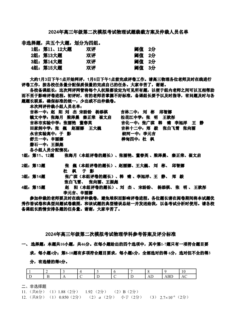吉林省吉林市2024届高三上学期第二次模拟考试物理答案
