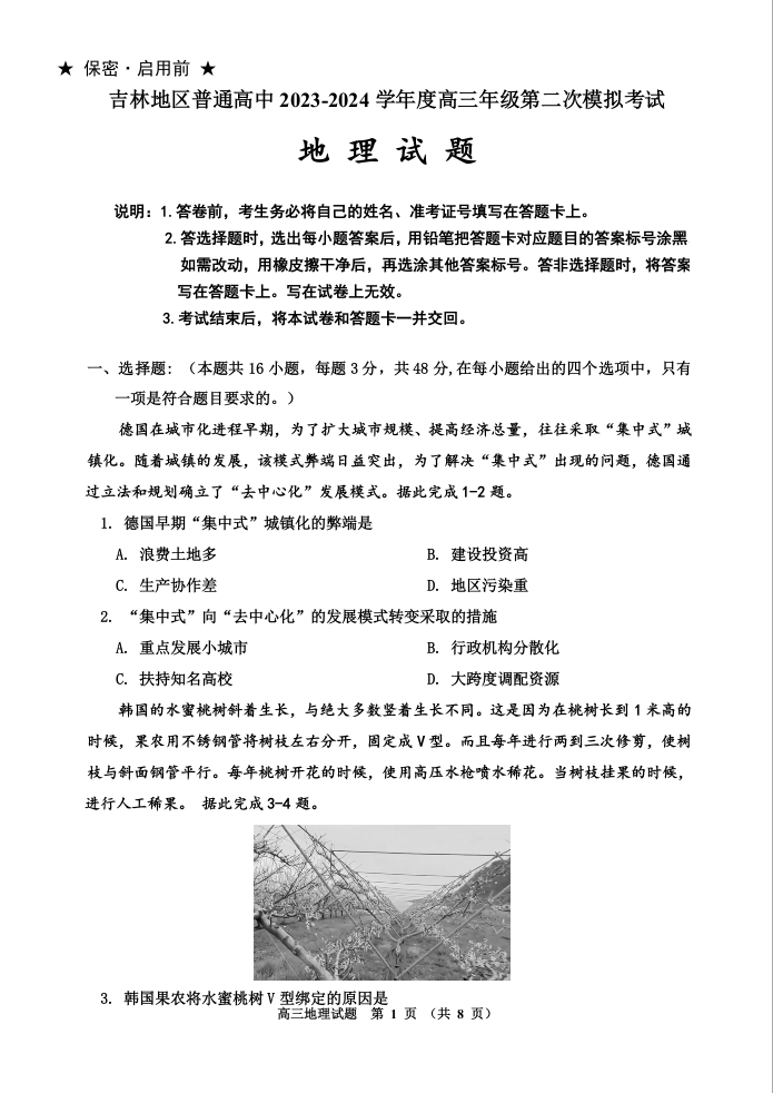 吉林省吉林市2024届高三上学期第二次模拟考试地理