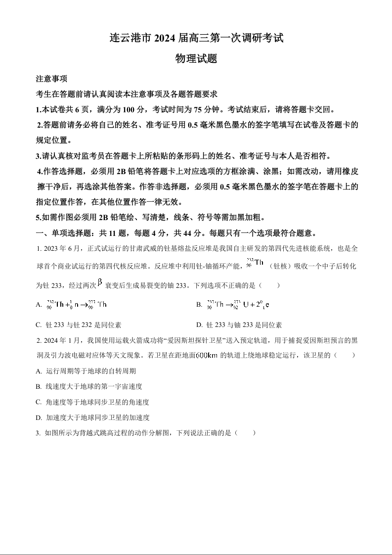 江苏省淮安市、连云港市2024届高三上学期第一次调研考试(一模)物理(原卷版)