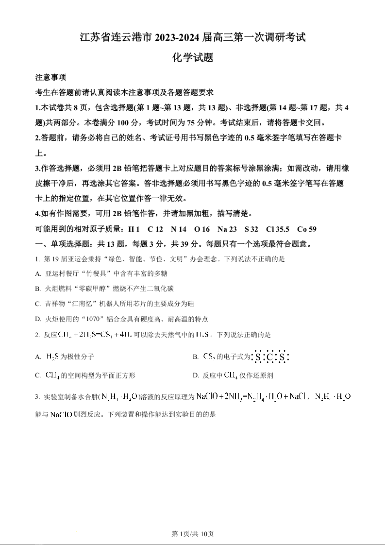 江苏省淮安市、连云港市2024届高三上学期第一次调研考试(一模)化学(原卷版)