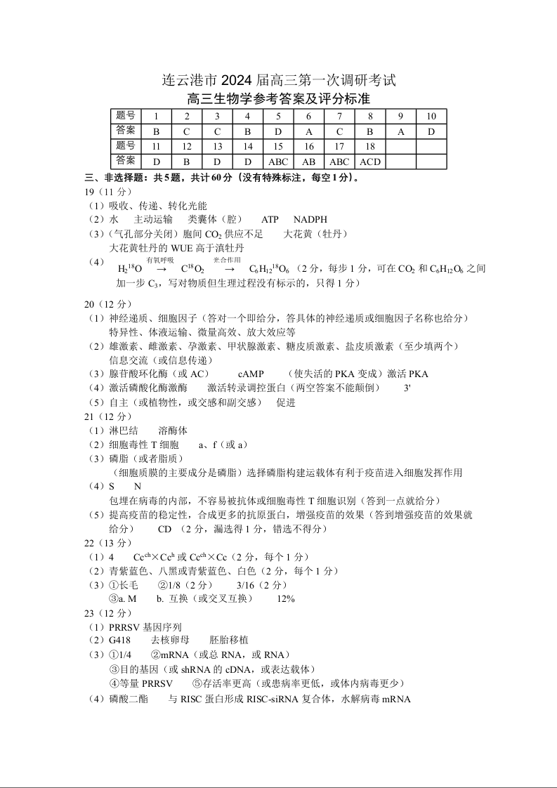 江苏省淮安市、连云港市2024届高三上学期第一次调研考试(一模)生物答案