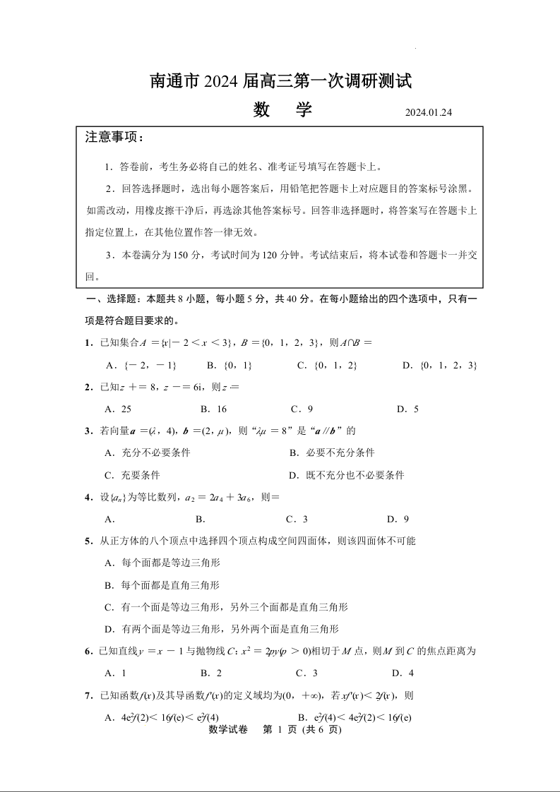 江苏省南通市2024届高三第一次调研测试(南通一模)数学(原卷版)