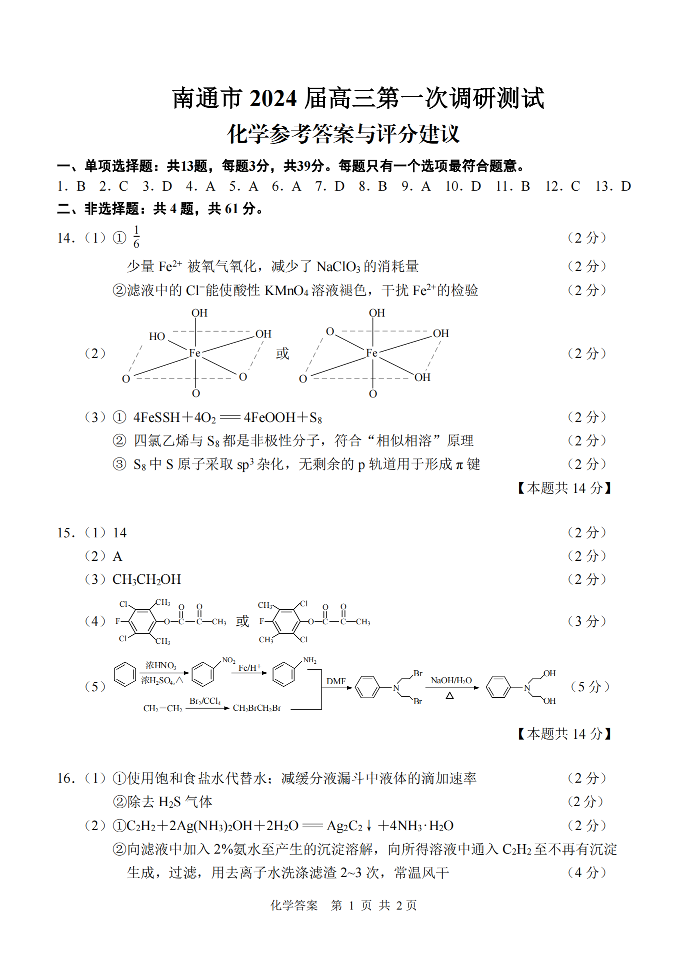 江苏省南通市2024届高三第一次调研测试(南通一模)化学答案
