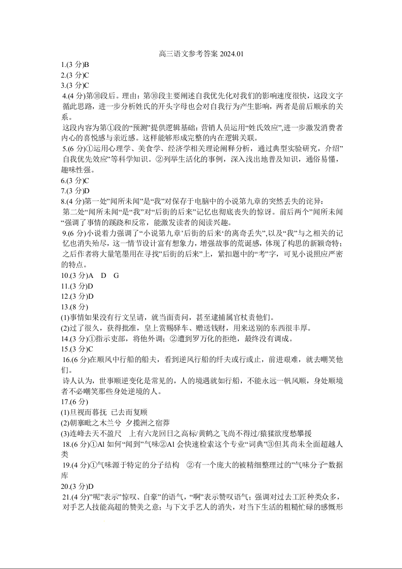 江苏省苏州市2024届高三上学期1月期末学业质量阳光指标调研语文答案