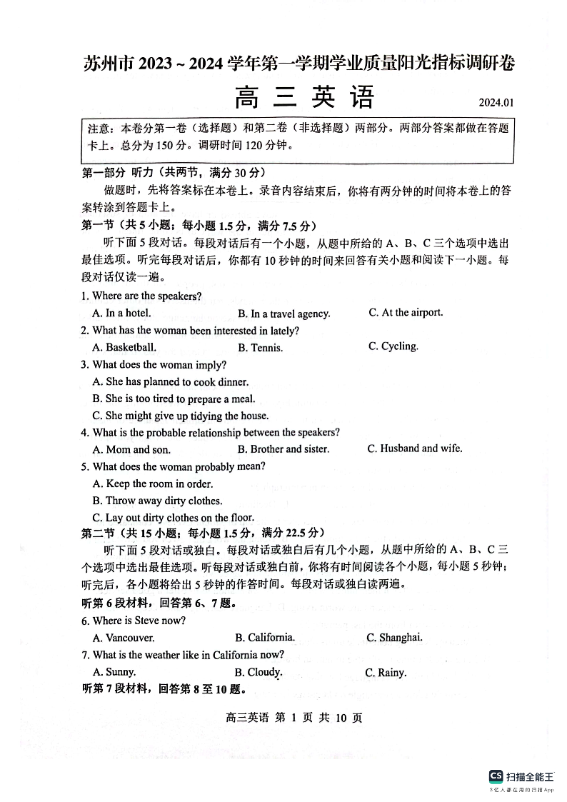 江苏省苏州市2024届高三上学期1月期末学业质量阳光指标调研英语