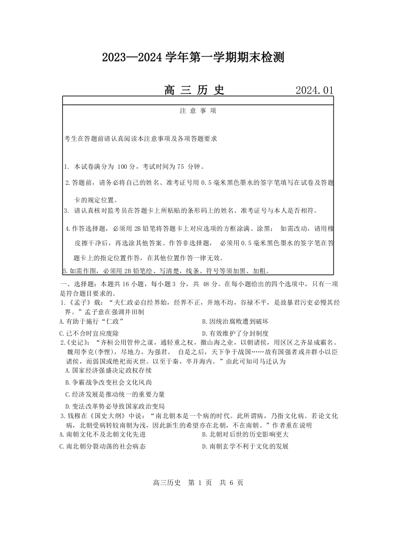 江苏省扬州市2024届高三上学期1月期末考试历史+答案