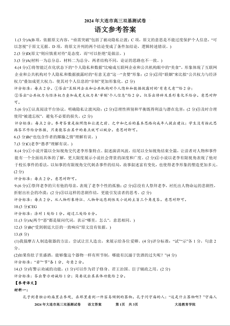辽宁省大连市2024届高三上学期期末双基测试语文答案