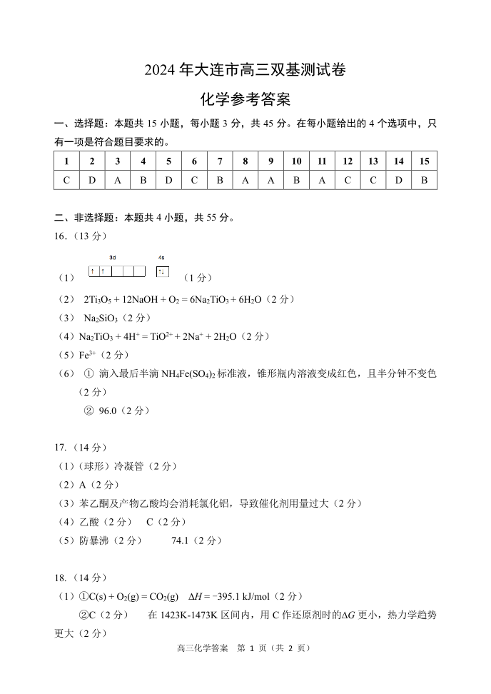 辽宁省大连市2024届高三上学期期末双基测试化学答案