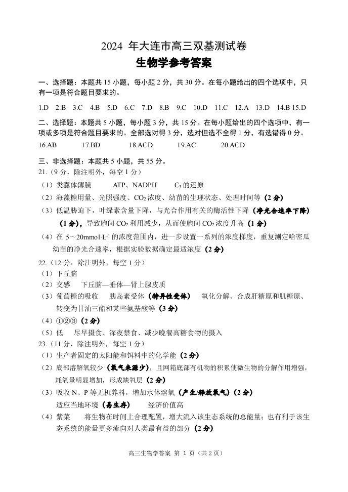 辽宁省大连市2024届高三上学期期末双基测试生物答案
