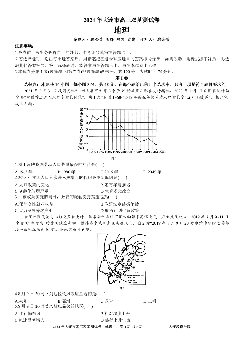 辽宁省大连市2024届高三上学期期末双基测试地理