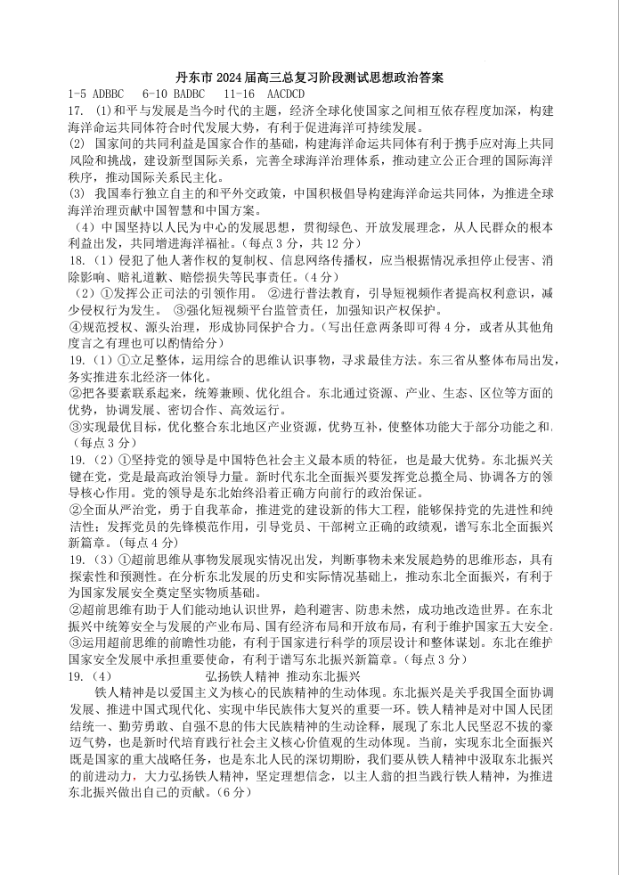辽宁省丹东市2024届高三上学期期末教学质量监测政治答案
