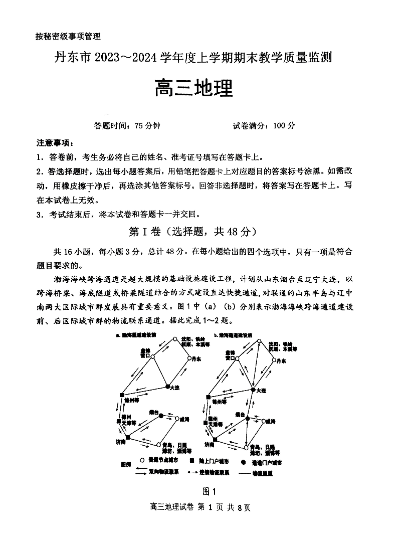 辽宁省丹东市2024届高三上学期期末教学质量监测地理
