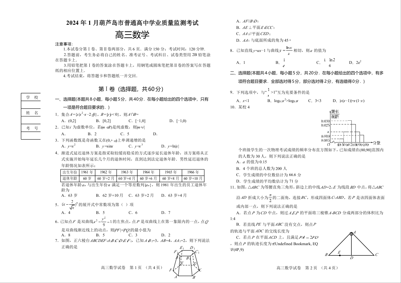辽宁省葫芦岛市2024届高三上学期期末学业质量监测数学
