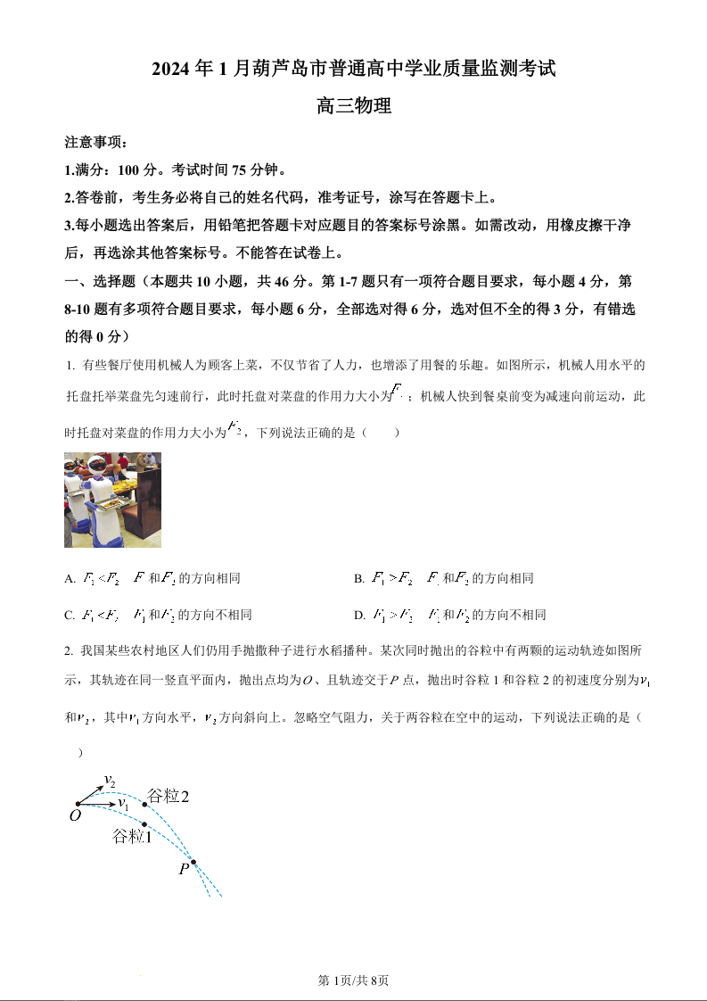 辽宁省葫芦岛市2024届高三上学期期末学业质量监测物理(原卷版)