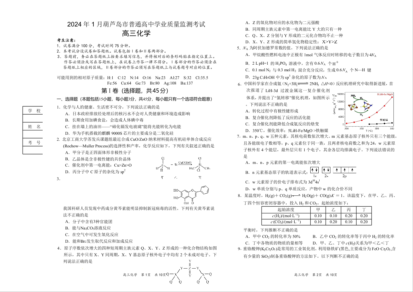 辽宁省葫芦岛市2024届高三上学期期末学业质量监测化学