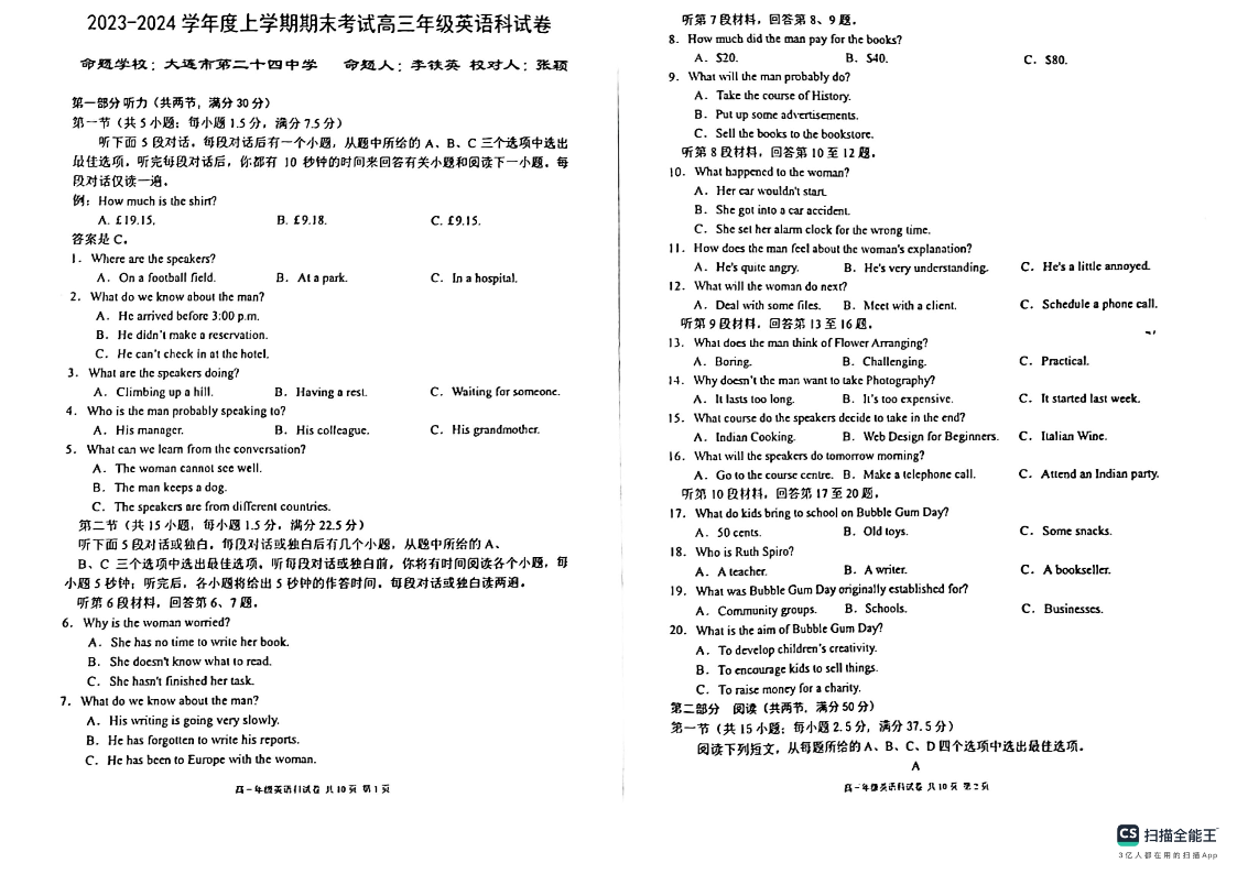 辽宁省五校联考(大连市二十四中学、大连八中、辽宁省实验中学、鞍山一中、东北育才学校)2024届高三上学期期末考试英语