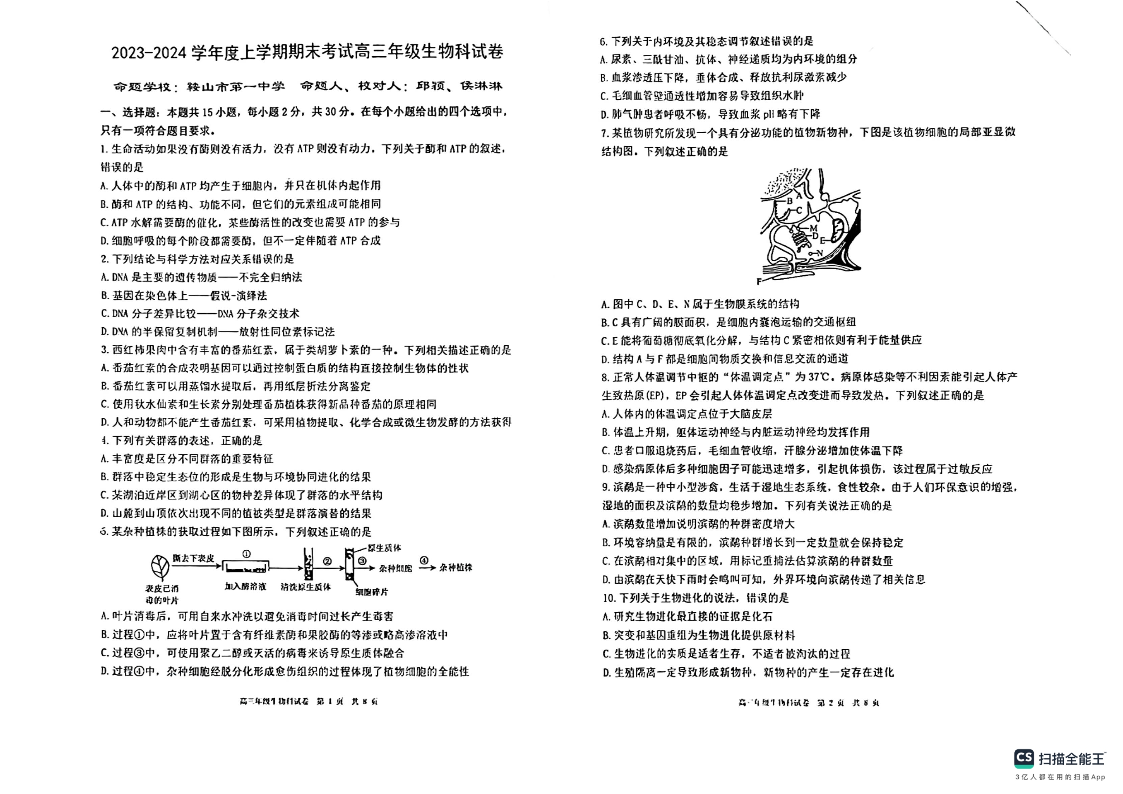 辽宁省五校联考(大连市二十四中学、大连八中、辽宁省实验中学、鞍山一中、东北育才学校)2024届高三上学期期末考试生物