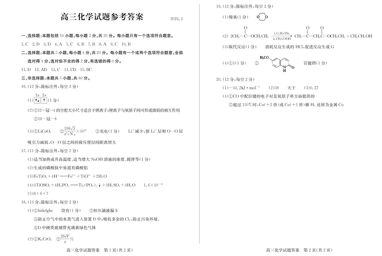 山东省滨州市2024届高三上学期期末考试化学答案