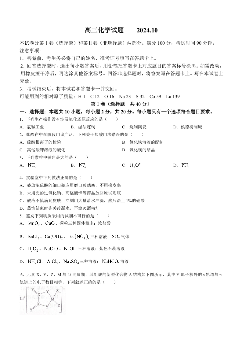 山东省德州市2024届高三上学期期末考试化学