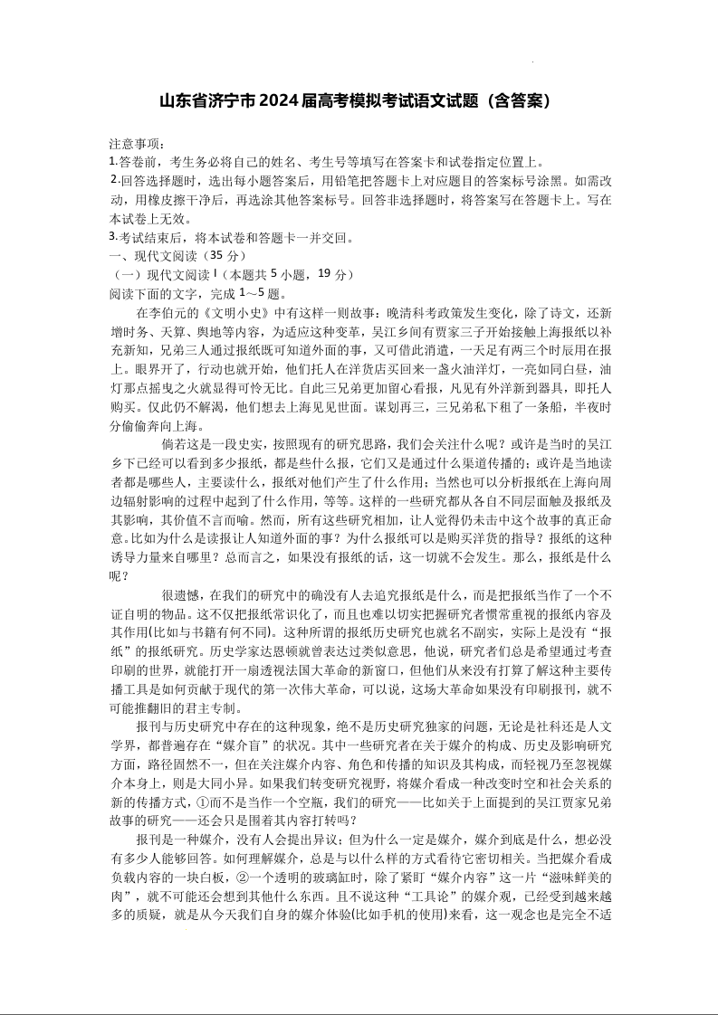 山东省济宁市2024届高三上学期1月期末语文+答案