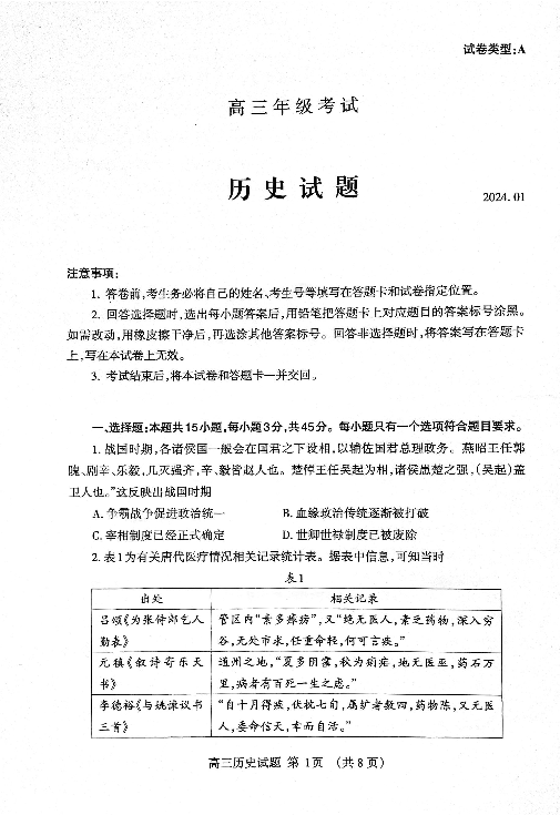 山东省泰安市2024届高三上学期期末考试历史