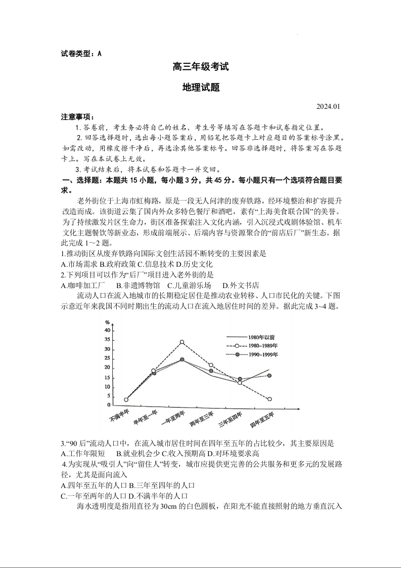 山东省泰安市2024届高三上学期期末考试地理试题+答案
