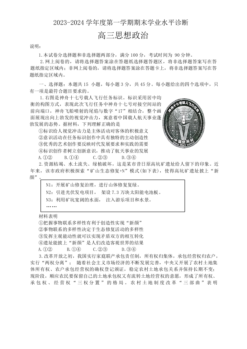山东省烟台市、菏泽市2024届高三上学期1月期末考试政治