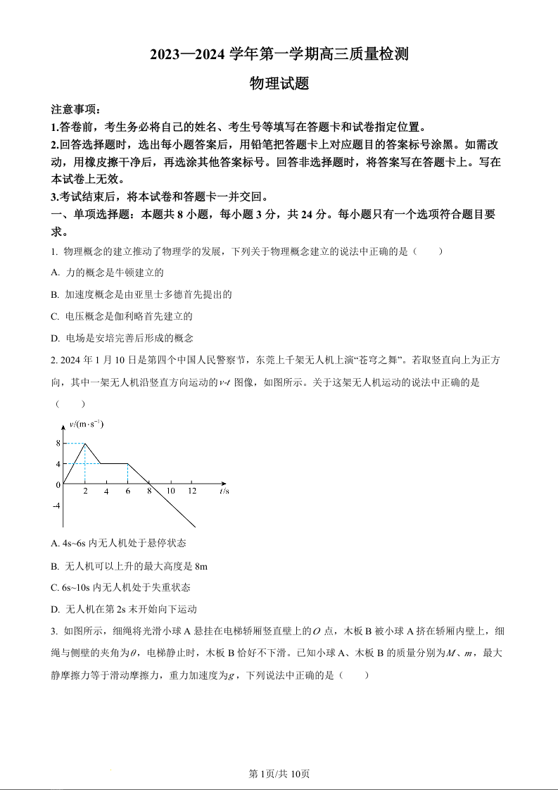 山东省枣庄市2024届高三上学期1月期末质量检测物理(原卷版)
