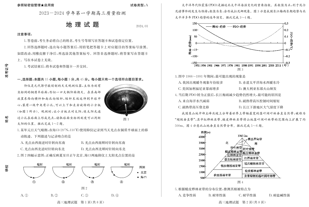 山东省枣庄市2024届高三上学期1月期末质量检测地理