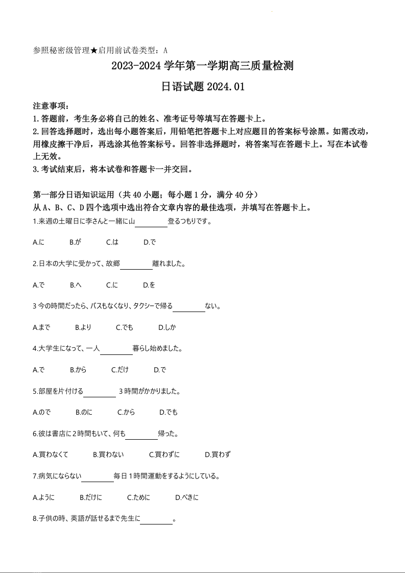 山东省枣庄市2024届高三上学期期末考试试题日语+答案