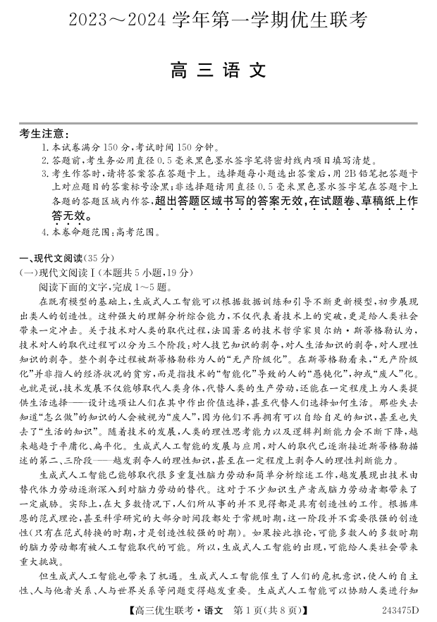 山西省2024届高三第一学期期末优生联考语文