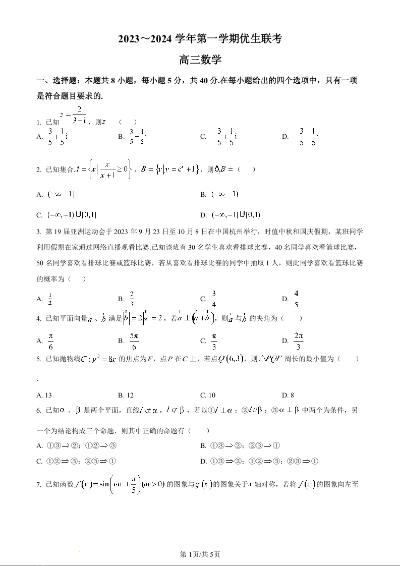 山西省2023-2024学年高三上学期期末优生联考数学(原卷版)