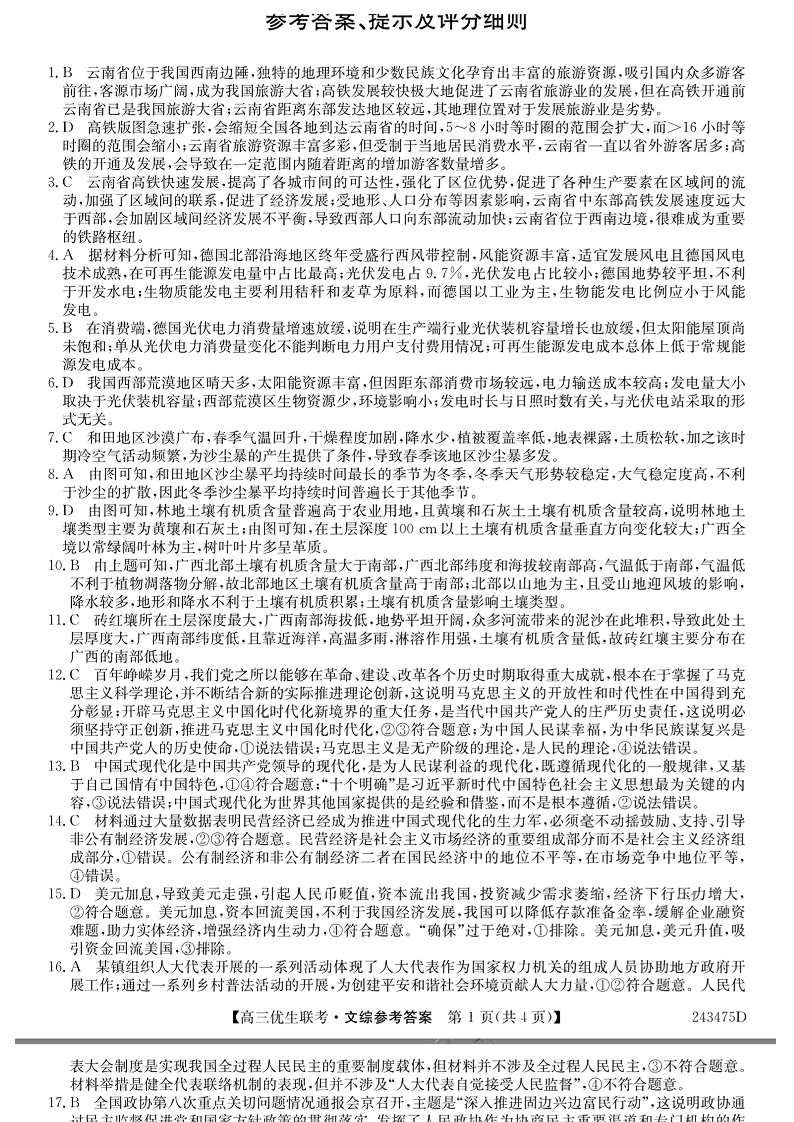 山西省2023-2024学年高三上学期期末优生联考文综答案