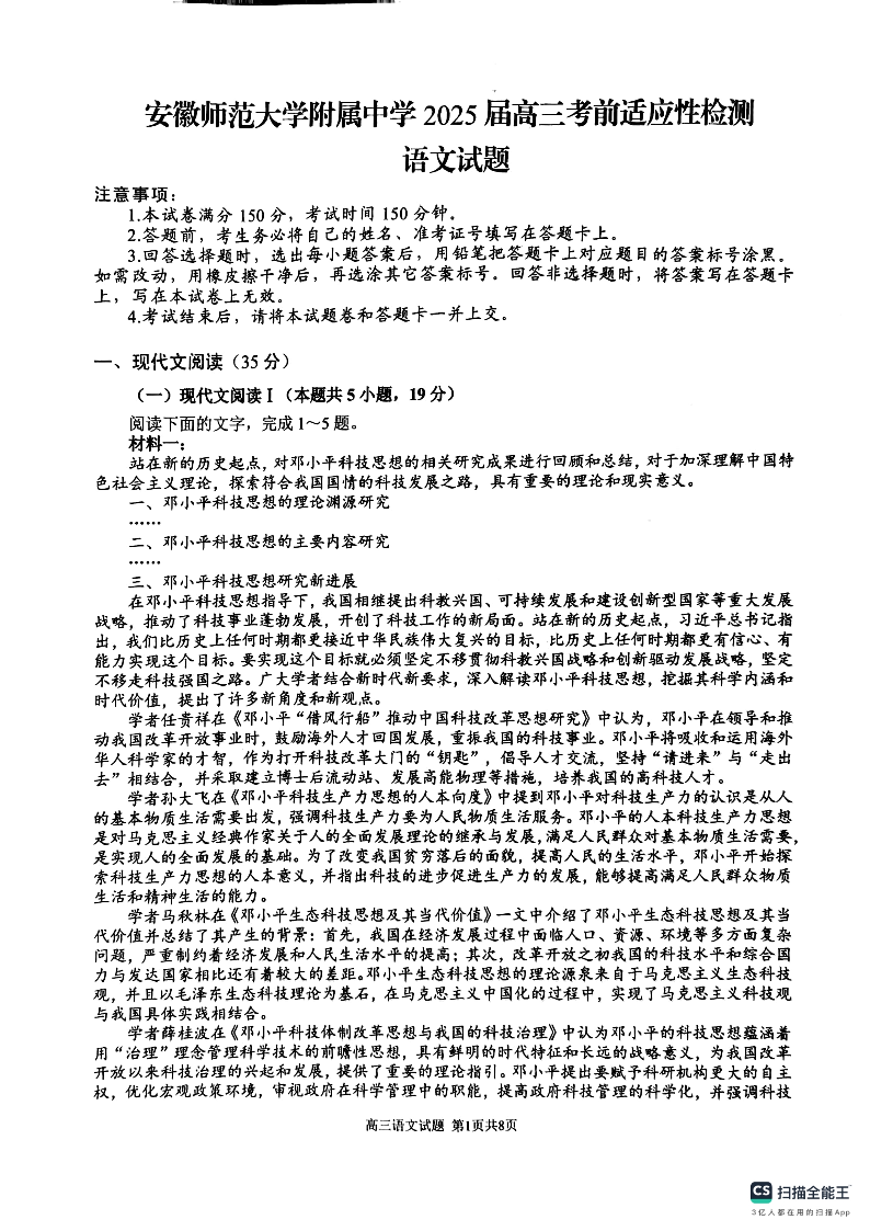 安徽省师大附中2025届高三下学期5月模拟预测语文