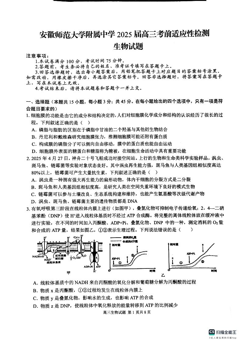 安徽省师大附中2025届高三下学期5月模拟预测生物+答案