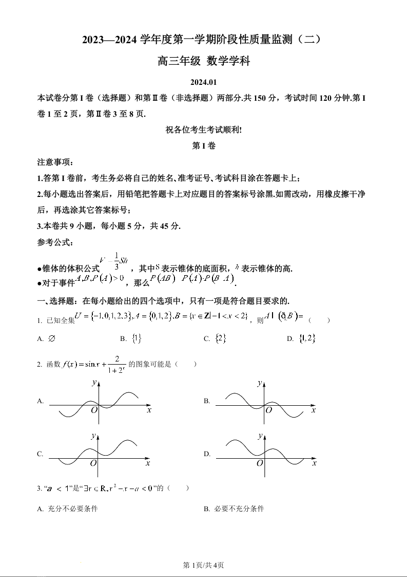 天津市南开区2024届高三上学期质量检测(二)数学(原卷版)