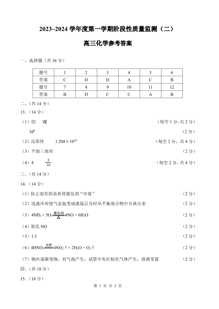 天津市南开区2024届高三上学期质量检测(二)化学答案