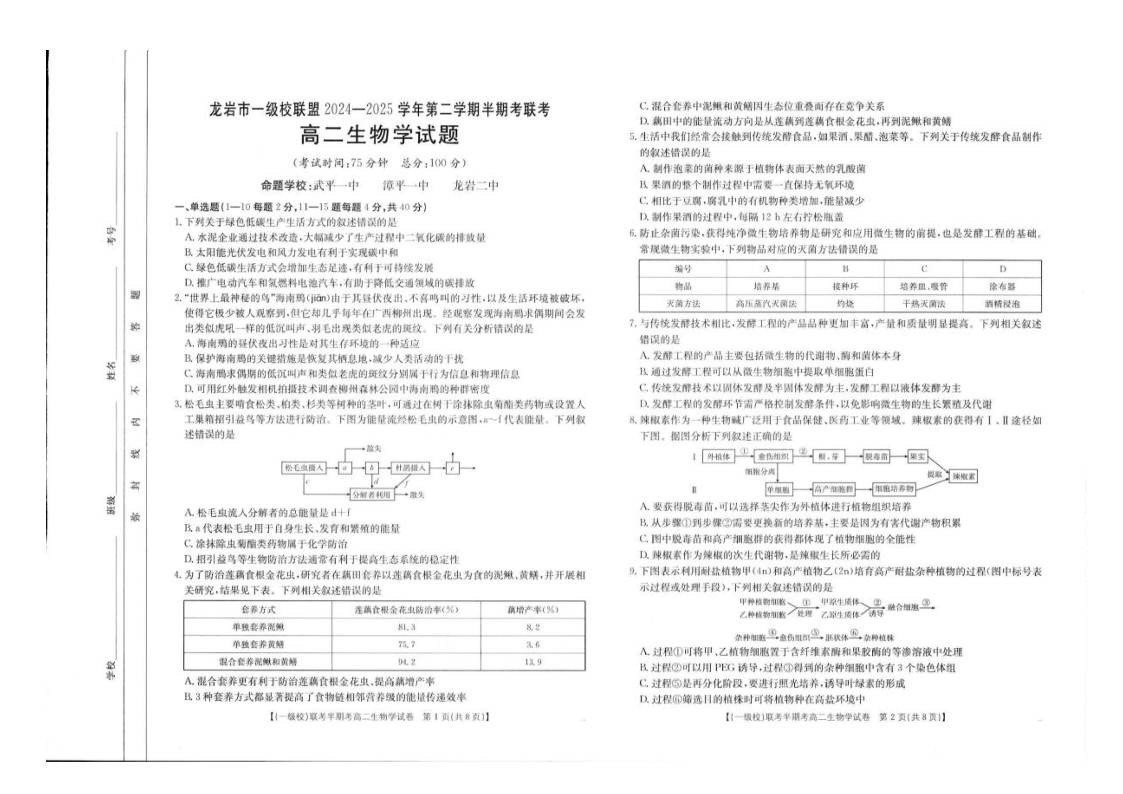 福建省龙岩市一级校联盟2024-2025学年下学期4月高二期中考试生物+答案