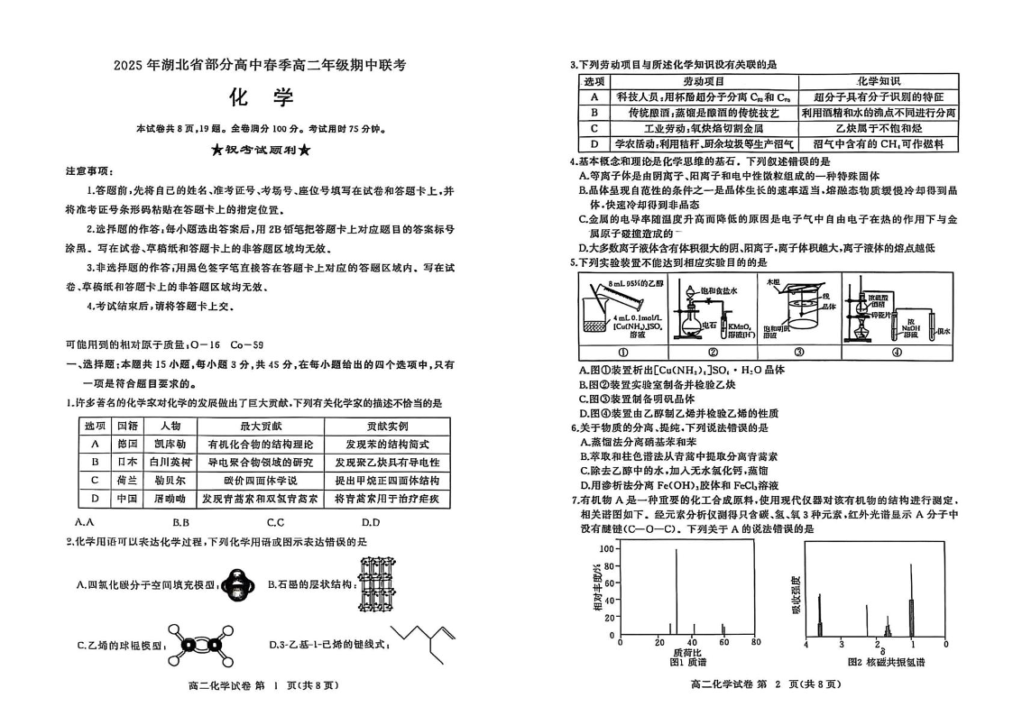 湖北省黄冈市十五校2024-2025学年下学期4月高二期中联考化学+答案