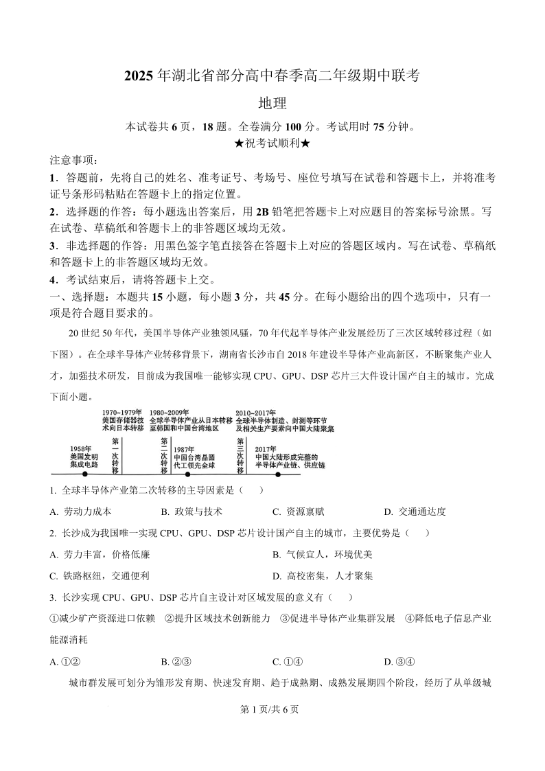 湖北省黄冈市十五校2024-2025学年下学期4月高二期中联考地理(原卷版)