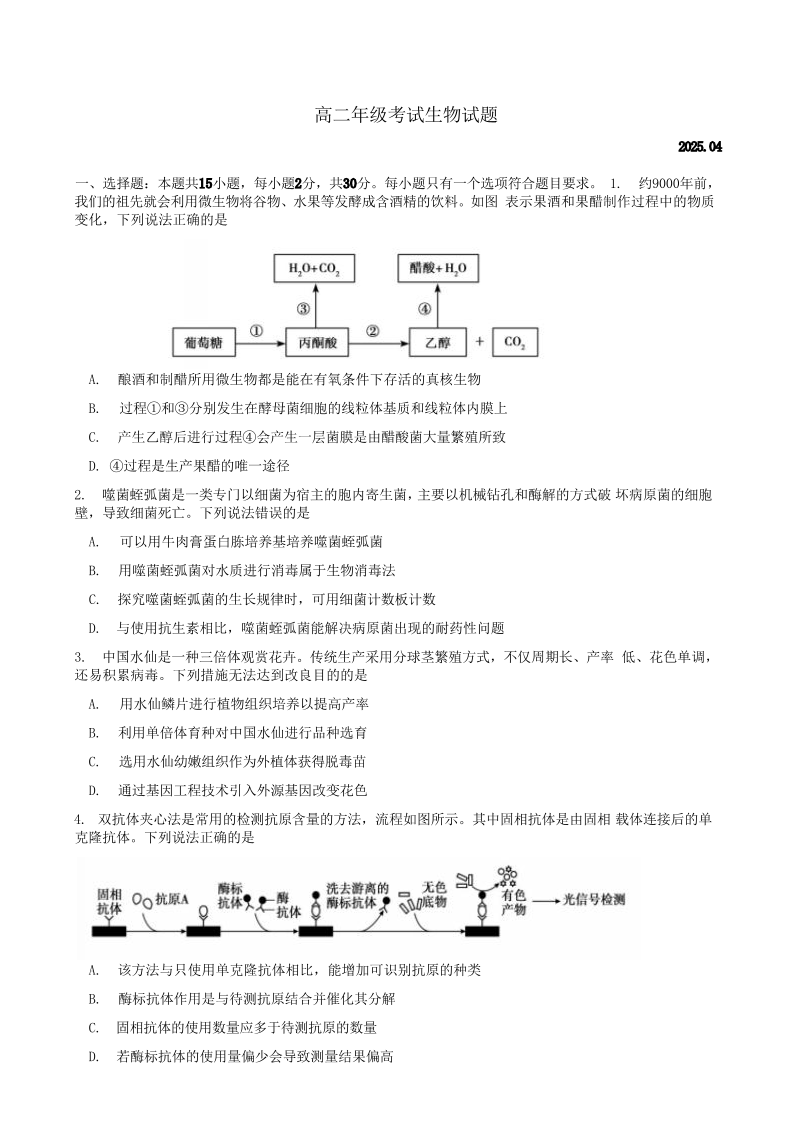 山东省泰安市2024-2025学年下学期4月高二期中考试生物+答案