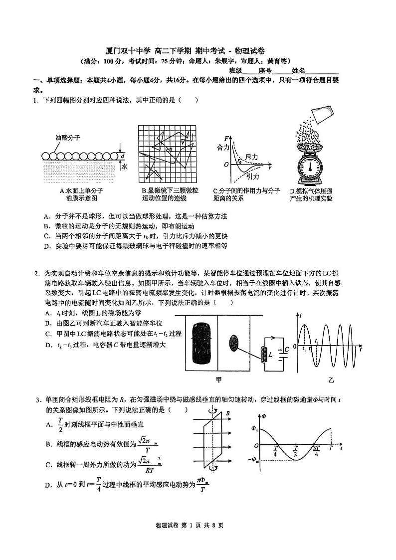 福建省厦门双十中学2024-2025学年下学期4月高二期中考试物理+答案
