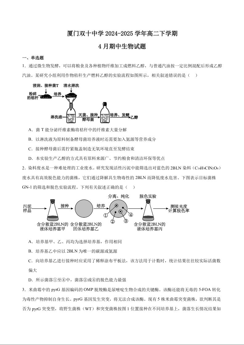 福建省厦门双十中学2024-2025学年下学期4月高二期中考试生物+答案