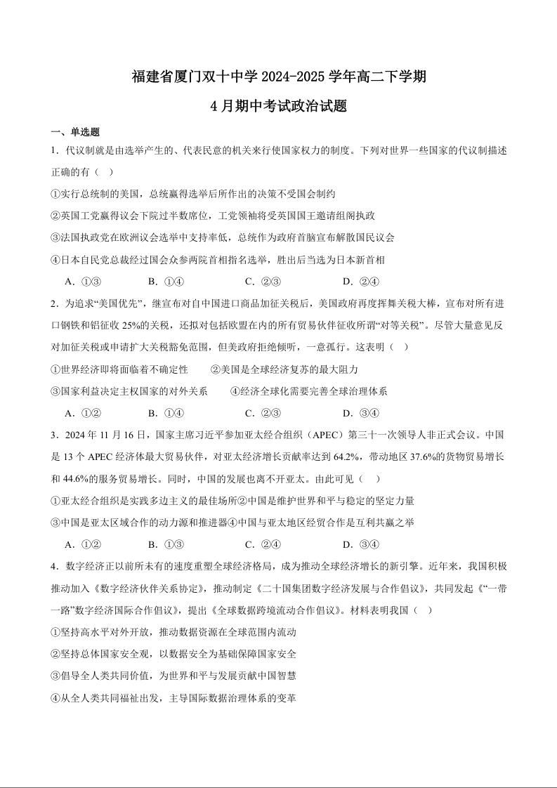 福建省厦门双十中学2024-2025学年下学期4月高二期中考试政治+答案