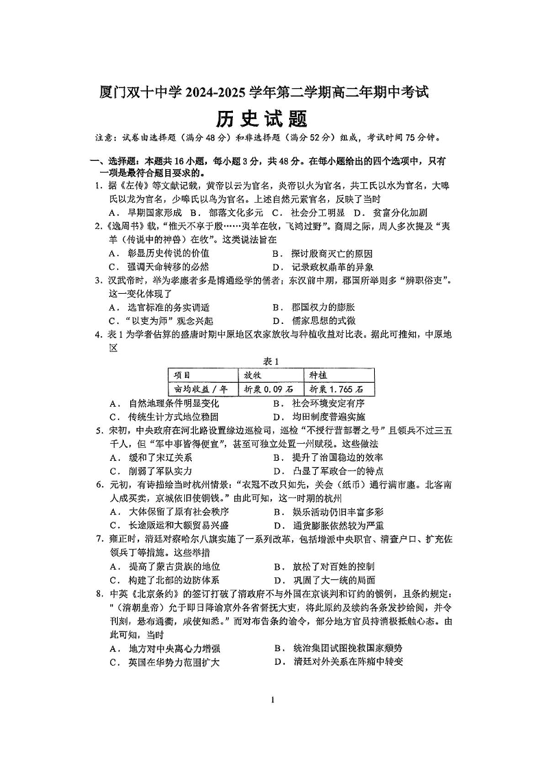 福建省厦门双十中学2024-2025学年下学期4月高二期中考试历史