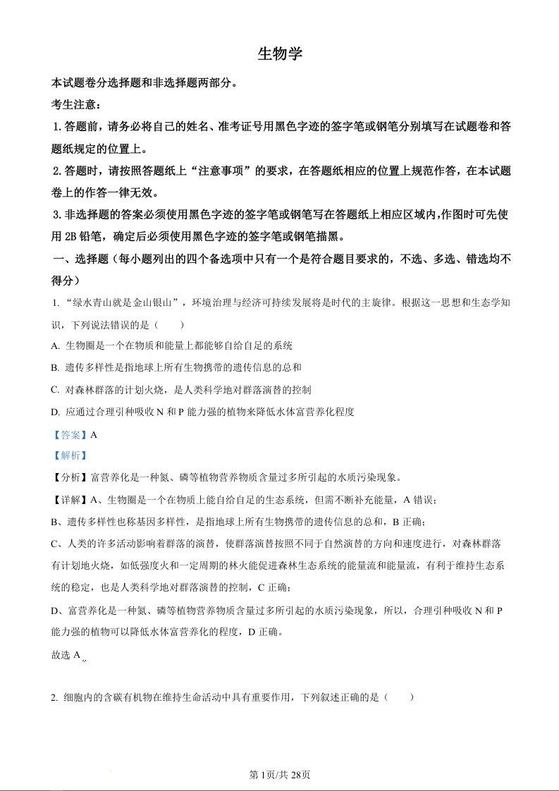 浙江省宁波市镇海中学2024届高三12月首考模拟生物(精品解析版)