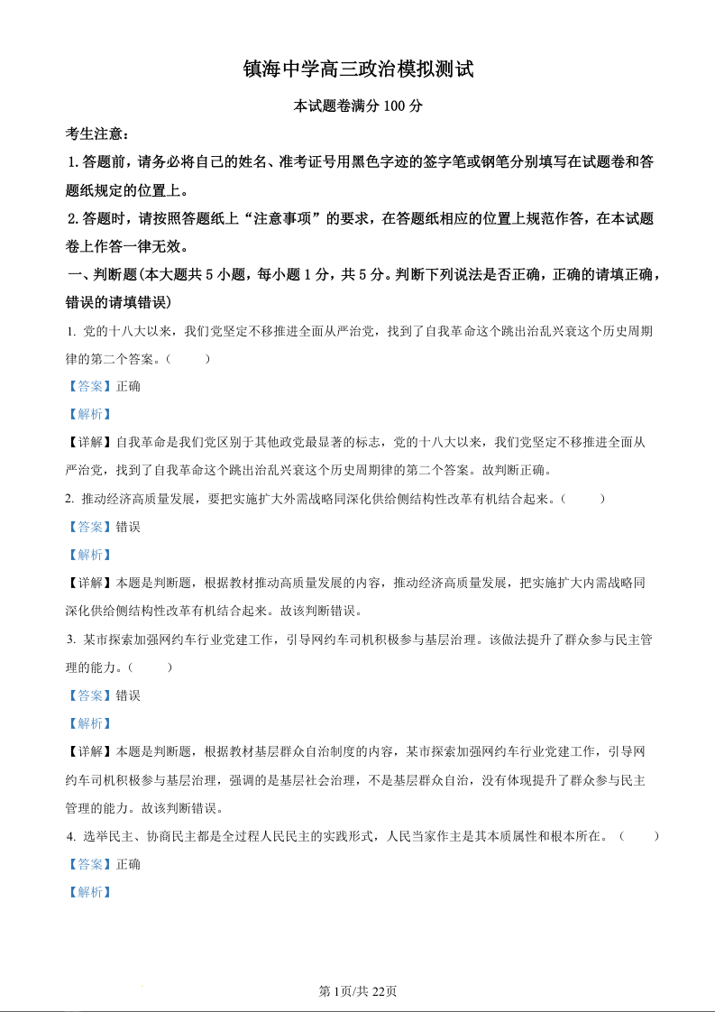 浙江省宁波市镇海中学2024届高三12月首考模拟政治(精品解析版)
