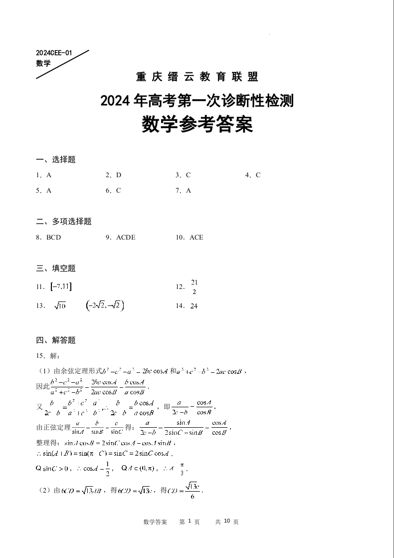 重庆缙云教育联盟2024届高三高考第一次诊断性检测(一模)数学答案